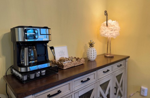The kitchen has an open floor plan into the dining room and living room. This kitchen is well-stocked with everything you’ll need during your stay, including an air fryer, a glass rinser, and a coffee bar, where you can make a pot of coffee, brew a k-cup or a Nespresso pod, craft a cappuccino (etc.), or make a cup of tea.