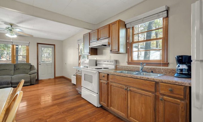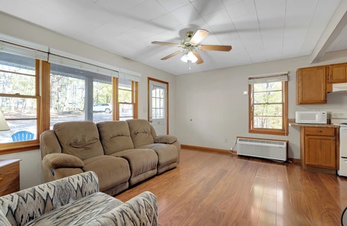 This unit, situated in a heavily wooded and shaded area, provides a tranquil escape. It features a fully equipped kitchen, a charcoal grill, and a picnic table for outdoor dining. Each of the three private bedrooms is furnished with a cozy queen bed, catering to comfort and relaxation. Plus, it's pet-friendly, ensuring that every member of the family can enjoy the getaway.
