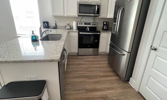 Discover this 3-bedroom gem in Pensacola. This townhome offers 4 queen beds, 3 bathrooms with a shower and bathtub, and a cozy living room with a queen size sofa bed. Guests can enjoy amenities like a washing machine, heating, fiber WiFi, and AC. Experience the magic of Pensacola at our adorable modern townhome. TV’s in each bedroom