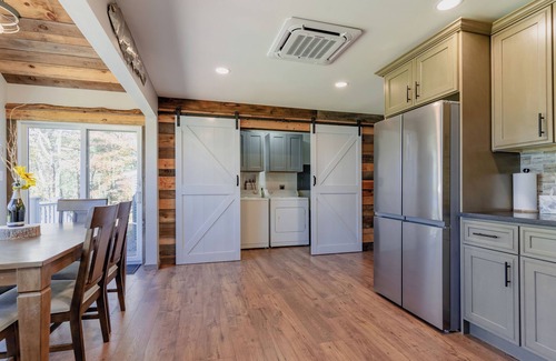 **Fully Equipped Kitchen** Cook up your favorite meals in our modern kitchen, complete with all the essentials and a dining area overlooking the lake.