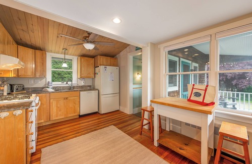 Inside, Sweet Retreat features a well-equipped kitchen for home-cooked meals, a dining area that seats six, and a cozy reading nook. The sun-drenched living room seamlessly opens to the sunporch, making it an ideal spot to relax and enjoy the surroundings. Upstairs, you'll find three inviting bedrooms: two with queen beds and one with two twin beds, offering comfort for families or groups. The second floor also features a full bathroom with a shower, a small powder room off the landing of the stairs, and an additional full bathroom in the basement with a shower/tub combo.