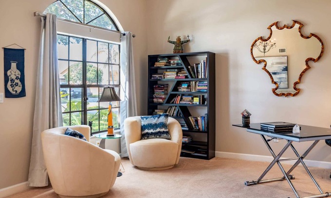 A dedicated workspace in a private room with a desk and ergonomic chair makes remote work easy and productive. Additionally, a flex space with a sofa, desk, and small sink offers extra comfort for extended stays. Guests can also enjoy a collection of books and reading materials for a cozy, relaxed evening.