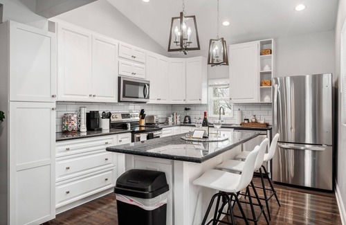 The lower level includes a cozy living room with a pool table and bar seating, a fully stocked kitchen with complimentary coffee, and a half bath. Enjoy movie nights on the smart 50-inch TV from the comfy L-shaped couch. The house also features a washer and dryer with cleaning supplies.