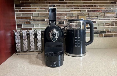 - Coffee Maker & Espresso Maker with a starter supply of coffee and sugar, and a complete custom tea bar