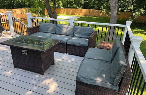 Step outside to the deck, where a comfortable sofa set and firepit create the perfect spot for evening relaxation. The backyard offers plenty of open space—great for kids to play or for simply enjoying the outdoors.