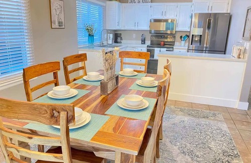 Has an open concept great for entertaining, with 2 sofas, a dining area and kitchen with all the items you may need to prepare a delicious meal. This home has tile floors and high living room ceilings, giving it an overall trendy, cozy vibe. There is a glass sliding door that leads out to a private fenced in backyard area with a pond, waterfall, and pool (all are open for the season), there's also a stone patio with outdoor furniture, which is great for catching some fresh air and enjoying a relaxing evening. The main floor also has two bedrooms, both with queen beds. There is also a full bathroom with a bathtub on the main floor.