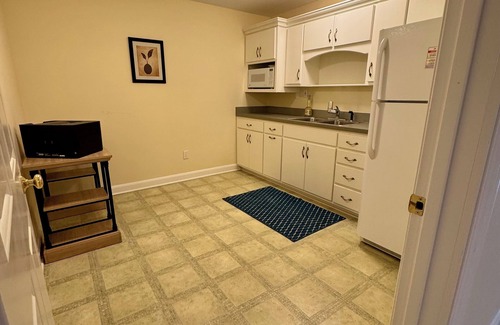Basement level: Large family room with sectional couch and large TV. Full bath with bath/shower. Second kitchen with refrigerator, microwave, sink and office area with printer. One br with a queen bed. One br with 2 full size beds.