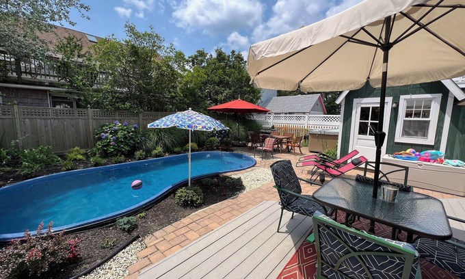 Your cozy getaway awaits in Beach Haven at this fabulous house. With 7 tremendous bedrooms, guests will have plenty of space to relax and unwind. Amenities like WiFi, a washing machine, and AC ensure a comfortable stay. The 4 bathrooms provide convenience for all. Fall in love with Beach Haven and enjoy the magic it has to offer. Saltwater heated pool (heated after May 15 until October 15), newly remodeled kitchen, newly enlarged dining and living areas, bar, outdoor shower and half bath. Engleside Avenue is a lovely area, walking distance to shopping, restaurants, bars/clubs, mini-golf, pharmacy, Fantasy Island Amusement Park, Thundering Surf Water Park, Chicken or the Egg. This rental was formerly two adjoining 2 bedroom units with 2 small kitchens and 2 small living rooms, with a separate rented efficiency. Upon receiving suggestions from our guests, we have opened up, combined, enlarged and remodeled these units to accommodate larger family groups in the living areas.