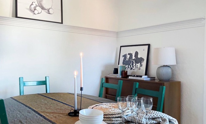 The kitchen is equipped with an oven, a stovetop, and a refrigerator, as well as a coffee maker, an electric kettle, and cookware. Other amenities at this 2-bedroom, 1-bathroom rental include a dining area, heating, and a dining table.