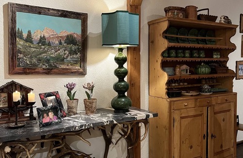 Upon entering the house, you are immediately immersed in the Alpine atmosphere with old wooden paneling and lovely authentic furniture. From there you can go 6 steps up or down towards the 2 bedrooms with en suite bathrooms. Another 6 steps up you arrive in the open kitchen/dining room with the open fire and large, south facing, balcony offering a magnificent view onto farms, woods, fields, and mountains. In summer the fields are full of flowers, and you hear the cowbells clinging as where in winter you see people on foot, by horse or skiing by, through the magic white landscape. Eventually 6 more steps up you reach the cozy sitting area with fluffy chairs and sofas. There is free parking available for 2 cars.