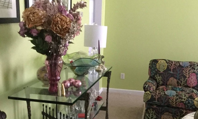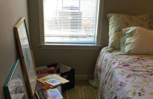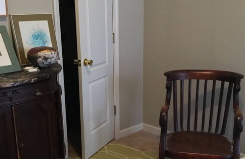 Home has 3 bedrooms and 2 bathrooms. You will have a private bathroom and a room with double bed, an antique bachelor's chest, an antique Asian side table, plenty of closet space. The kitchen-dining area is steps from your room. Refrigerator, toaster, microwave, coffee pot are available for use. Kitchen is a shared space. Living room has a gas fireplace, TV and lots of artwork and flowers. My 2 loves. My master suite is on other side of living room and somewhat secluded from your bedroom. The 3rd bedroom is my studio. I am a jewelry/bead artist. Home is all on one floor. There are no steps to enter the house by the front door. and if you miss your own pets while away, my 2 small dogs, Tookie and Tiara, obligingly can step in to fill the void.