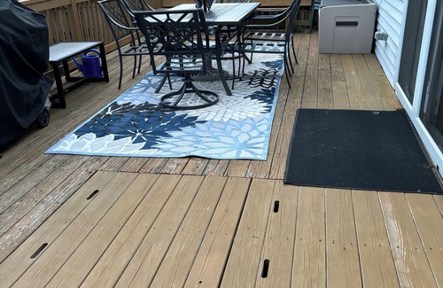 This 1850's house has an open-floor plan downstairs, with a dining area adjacent to the kitchen. It has access to a deck with gas grill and outdoor dining table. The upstairs has two bedrooms with 1 queen bed and 1 full bed, and a light and airy upstairs sitting area The downstairs has a 1/2 bath, and the upstairs has a full bath (shower only). This house was recently renovated.
