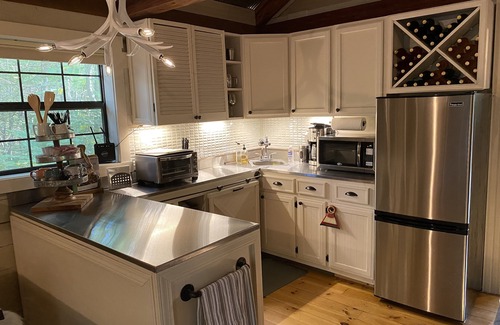 Known for its abundant charm and luxurious accommodations, privacy and serene atmosphere, our cabin is the perfect getaway for the romantic at heart. Our cozy and inviting home features a King Bed (lovely forest view visible from the comfortable bed through French doors), 2 Beautiful Stone Wood Burning Fireplaces, an extensive library with a variety of books, leather sofa and Flat Screen Smart TV. The cabin also has a functional (but limited) kitchen to prepare your favorite meals and a charcoal grill on the totally private deck, which is covered for outdoor dining even in a gentle rain. The bathroom provides a 2-person Jacuzzi tub that also serves as a stand-up shower, an antique makeup table and a private room for the commode. Outside the cabin you'll find a fire pit with everything you need to enjoy a relaxing campfire....just bring your firewood, marshmallows and hot dogs!