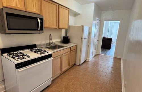 This bright and comfortable apartment features an oversized bedroom with plenty of space to stretch out and relax. The full bathroom includes both a shower and tub—perfect for a refreshing rinse or a long soak. Cook like you’re at home in the full kitchen, complete with a gas stove, microwave, and full-size refrigerator. The cozy living room is ideal for unwinding, and there’s also a desk if you need to get some work done during your stay.