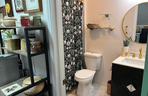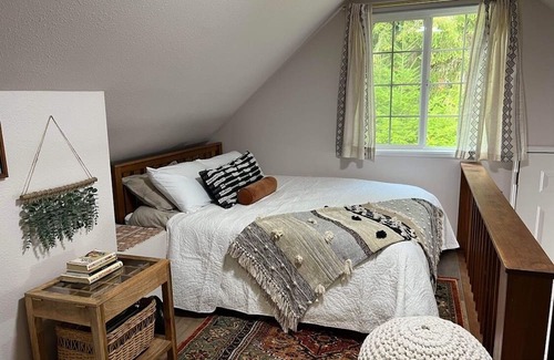 Loft studio perched above the main house garage. Queen bed with private bathroom and kitchenette. Kitchenette includes microwave, hot plate, and toaster oven. Mini split with heat and A/C. Dedicated parking.