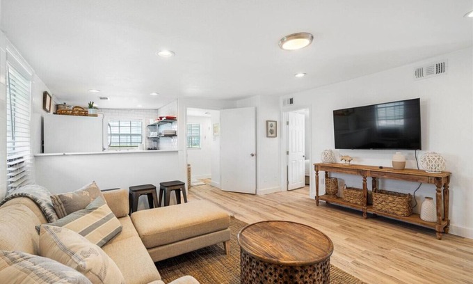 Unwind in the carefree vibe of Wait n' Sea. This charming beach house features an open floor plan, perfect for relaxing and connecting with ease. An inviting sofa sits opposite a flat-screen television, creating a cozy spot to curl up with a good book or enjoy a movie marathon with your crew. Beach-inspired décor completes the picture, reminding you that you're on a dreamy beach vacation.