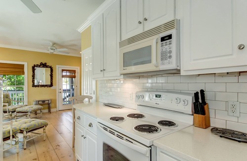 Enter through the second floor's front door to see the living room. It's a bright and airy space with plush seating spread out across the room. Activate the ceiling fans, and open the windows for a cool, ocean breeze. The Little Beach Cottage is only a few blocks from the beach, so you'll feel the salty air as it comes through the windows.
