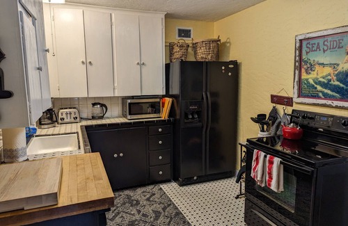 This comfortably decorated home has just been updated with new linens, cookware, 55' Smart Bluetooth TV, BBQ grill and more. The backyard has a fun tiki bar, outdoor dining set, fire ring, horseshoe pit and is fenced for dogs.