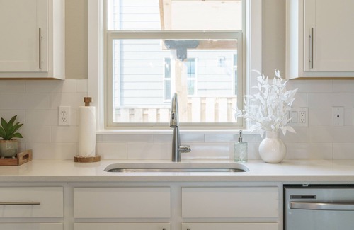 6-seat dining table garnished with table runner and classy centerpiece. Extra seating available at the kitchen island with four swivel bar stools. Dining table works great for meals, business/work station or breaking out the board games. Elegant kitchen with an island and brand new stainless steel appliances. At quick glance you’ll see a 5-burner gas stove/oven, over-the-range microwave, dishwasher, handle less fridge (groove to open at top/bottom of fridge doors and top of freezer door), coffeemaker and tea pot. Don’t let the crisp, clean, simplicity of this kitchen fool you - we have more surprises tucked away in our cabinets and drawers.