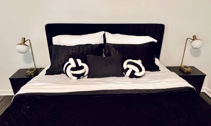 Charming black white & gold bedroom ensuite at The Retreat | House in Chattanooga
