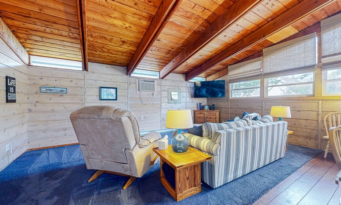 Inside you’ll find a sun-soaked, open-concept living area hosting wood-panelled interiors, high ceilings, and plush seating for ultimate comfort. Feel right at home as you snuggle up on the sofa to stream your favorite movies from your individual accounts. A full kitchen boasts modern appliances, lots of storage space, and everything you need to create home-cooked meals with ease. Gather at the adjacent dining table to share hearty feasts and then break out the board games for a Scrabble tournament.