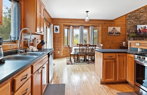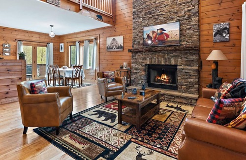 This charming two bedroom cabin has an open concept main floor with high vaulted ceiling and beautiful tongue and groove walls. The Living room has comfortable leather furniture situated around the floor-to-ceiling stacked stone fireplace and smart TV. Relax by the fire after a day on slopes, or hiking on the Blue Ridge Parkway. The dining table has seating for six guests and is access to the deck where you can enjoy the hot tub after a day of playing golf or riding the train at Tweetsie Railroad. Fire up the gas grill or cook your favorite meal in the fully stocked kitchen. There is plenty of counter space for food prep, with additional seating for two at the peninsula. The front porch is fully covered and is the perfect place to enjoy your morning coffee while taking in the fresh mountain air.
