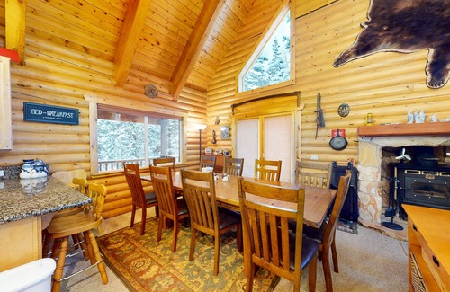 Highlights of the cabin itself include soaring, wood-paneled ceilings and walls, an open layout, and a cozy space ideal for gathering with friends and family. Spend quiet mornings cooking in the full, well-equipped kitchen, then serve up your mealtime masterpiece at the adjacent table before strapping on your snowshoes to explore the snowy scenery outside.