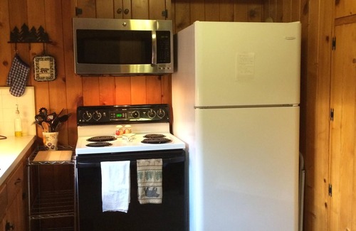 We offer free WiFi and Direct TV, a wood-burning fireplace with free firewood provided. The full-size kitchen has a full-size range and refrigerator, a microwave, toaster and crockpot, Keurig and regular coffee maker. Spices, tea, coffee, hot choc, popcorn and basic condiments are provided. You are welcome to use what you find in the kitchen. Many guests leave what they haven't used for the next guests. The dining area has seating for 6.