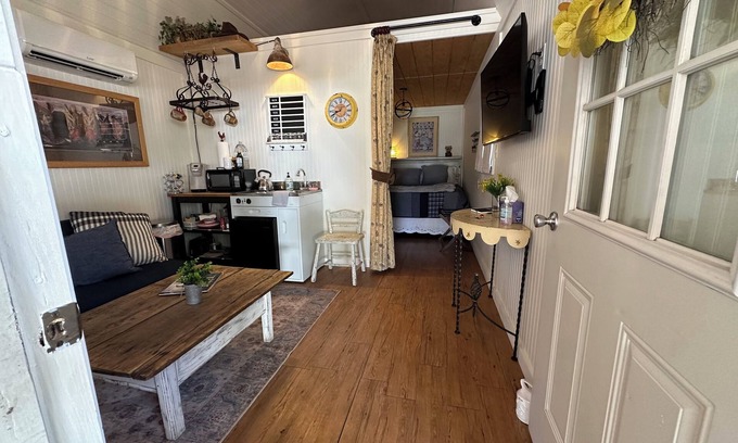 Escape to this adorable cabin in the Hill Country! This cozy retreat features 1 bedroom with a queen bed, full bathroom, living room/kitchenette with a Mitsubishi ductless AC/Heat and dining area. Guests can unwind in the marvelous surroundings and take advantage of the convenient location giving you a short drive into Austin, Wimberly and any of the surrounding wedding venues, distilleries, breweries and vineyards.