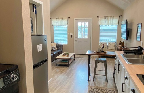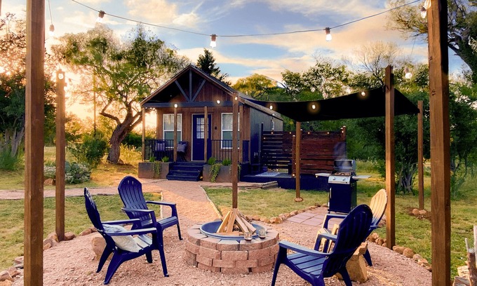 Tucked among trees along a seasonal creek, Persimmon Tiny Home Retreat is the perfect getaway. It’s located less than 20 miles from both Inks Lake & Lake Buchanan and down the road from the Llano River. Nestled carefully in nature, this modern tiny house cabin lacks no comfort or convenience. It has one extremely comfortable queen bed and bathroom. Complete with a micro chef’s kitchen featuring contemporary appliances, top-notch furnishings and fine rustic-luxury finishes throughout, this 504 sq. ft. cabin offers a secluded one-of-a-kind experience.