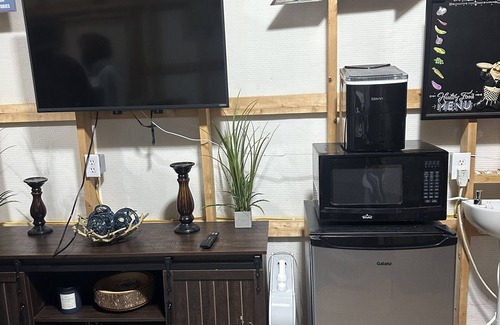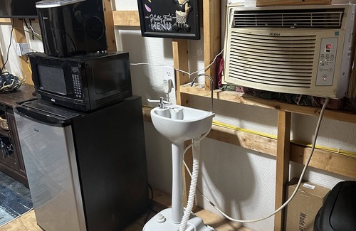 This Versailles cabin sleeps 4, 1 queen high quality air mattress in the loft and 2 additional fold out high quality cots. Cabin boasts AC and heating guests can stay comfortable year-round and a pond for fishing. Sectioned off bathroom features a refreshing campers shower with stand in shower tub... and toilet equipped with bio-degradable waste bags, There's even a cozy living room with a futon for additional space. We think our place will help you experience everything Versailles has to offer. This comfy get-away has a flatscreen, inside and outdoor games at your disposal. Local Tv channels are available. Also included is a coffee maker (with coffee), air fryer, fish fryer and hot plate. There is also a vacumn and shampoo machine. Toiletries are included. The cabin also has a washer and dryer. You must bring your own water for drinking, bathing and cleaning. Cabin is 12 minutes from the Lake of The Ozarks. There is plenty of parking and outside seating. Enjoy all nature has to offer on this 6 acre property.