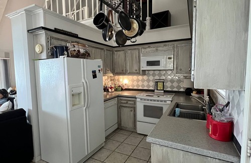 Bedrooms include a master with a king bed and a two king bed loft (for a total of 3 king beds). The master bathroom has the standard vanity, toilet, bathtub/shower, and the loft bathroom is accessed by two doors with one leading to the vanity and toilet, and the other leading to a bathtub (no shower). There is plenty of space for everyone to keep up with daily routines.