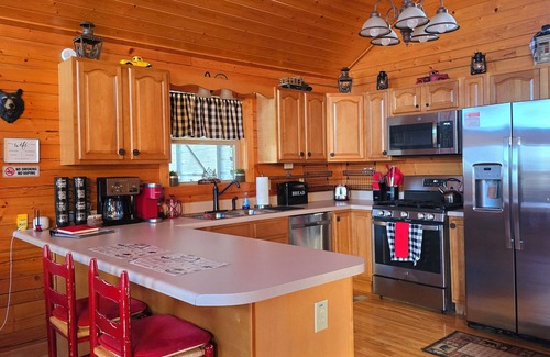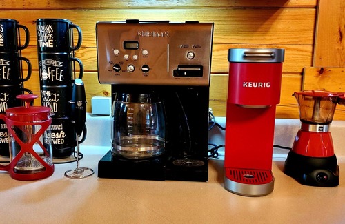 - Fully stocked kitchen with stainless steel appliances, coffee makers, toaster, & waffle maker