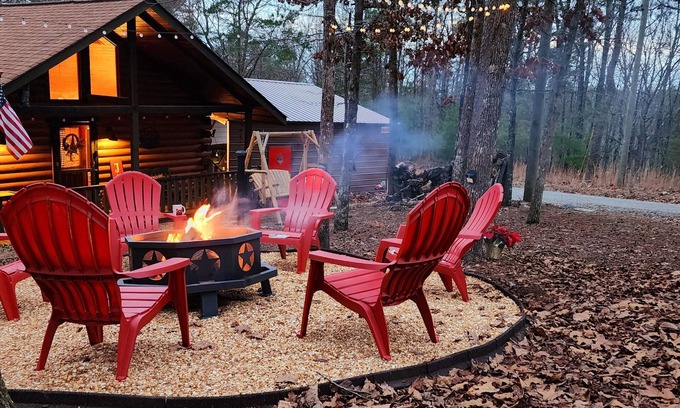 This single-story cabin accommodates 4 guests with 2 bedrooms, 1 sofa bed, a game room, a fireplace, and an outdoor fire pit.