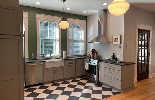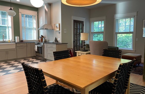 CARRIAGE HOUSE APARTMENT • 195B North Prospect St. Burlington, VT 05401 The building has been our graphic design studio for the last 20 years. We’ve recently moved out and back into our main house, on the same property, and have added a kitchen and shower to our one bedroom space. Our property is easy walking distance to UVM and the UVM Medical Center. DETAILS - One bedroom with a queen bed; full kitchen with all new high-end appliances & well stocked for cooking meals; bathroom with tiled shower, antique pedestal sink; living room/ dining area with table and 4 chairs (more possible), day bed/twin bed, upholstered chair(s); large TV with streaming services; new washer/dryer on the ground floor. Upstairs lining space is 900 square feet plus downstairs entrance area/ laundry. Off street parking. Large property surrounded by mature trees- we called this our treehouse when it was our workspace. Lot’s of light, set back from the street, so it is quiet. 5 blocks from UVM green, 15-18 minute walk to the patient entrance of the hospital - less than one mile. 18-20 minute walk - one mile to Downtown Burlington. 35 minute walk to Waterfront Park 1.6 miles. All utilities / Wifi / Washer, Dryer / Ample parking included
