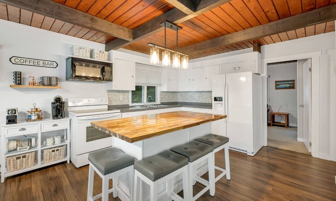 This is a charming chalet with beautiful cherry wood ceilings accented with dark wood beams, a wood burning stove, butcher block island, full stand-by generator, AC mini splits, and so much more.