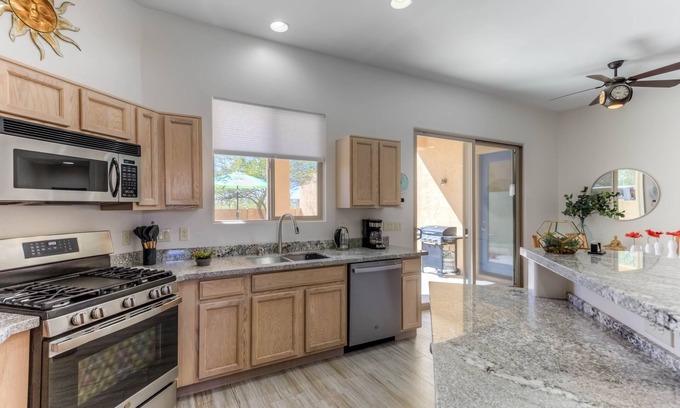 Kick back and relax in this comfortable, stylish 3 bedroom, 2 bath home located in the heart of friendly Civano. Our newly updated home is completely furnished with chef-ready kitchen, SS appliances and granite counter tops, and a SMART TV. The neighborhood has 2 community swimming pools, tennis/pickle ball courts, and desert walking paths. Conveniently located near groceries, shopping, restaurants, and mountain/road biking/hiking trails. We are located minutes from the Saguaro National Park.