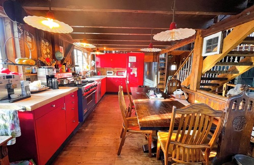 This 200 year old timber frame barn was rescued from near collapsing by artist Randy Polumbo. Using a collapsed barn for parts, every inch is old wood, all natural and non toxic materials. Most of the barn is built of salvaged materials from NYC construction projects with Calatrava’s discarded Bathtub, an outdoor shower from the Sherry Netherland Hotel, and parts from glorious uptown mansions and brooklyn factories alike. Enjoy chilling out in the hammock, the yard, or bike to the beach or cook a major meal in the spacious well appointed kitchen. What makes it “funny” are numerous amusing features like the giant iron bell and string to fire it, that Randy’s mom could not recall “bellport” and calls the town “bellevue” to this day. This is a very relaxing space where anything or nothing is enjoyable from crafts, music, cooking to a work project.