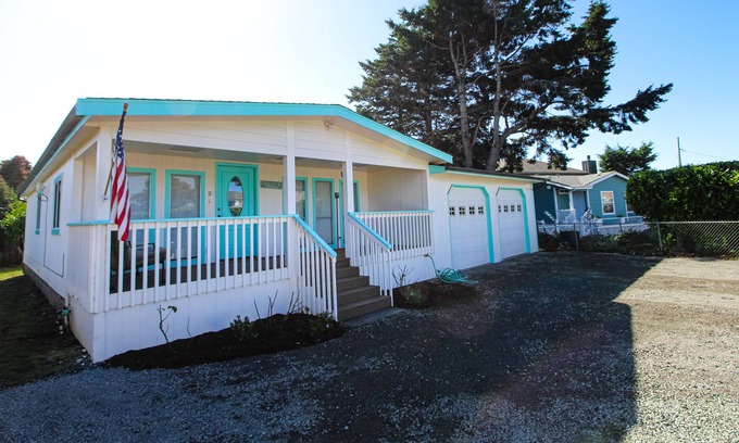 Escape to the southern Oregon coast and experience a memorable stay at this charming cottage near the water. Designed with bright accents, this home features a single-story layout with a well-equipped kitchen and two cozy bedrooms, one of which has a writing desk -- ideal for remote work or online school. Peruse a collection of board games and gather around the living room coffee table for family game night. Added perks include upgraded flooring throughout and a convenient laundry room. Kick back and relax on the covered front porch, furnished with seating for two.