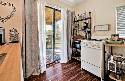This sweet cottage has a queen size bed with a quality mattress and bedding, a dining area inside for two or eat outside on the wrap around deck while enjoying the wildlife or just the silence. There is a full bathroom with a shower. Enjoy your own stocked kitchen (pots, pans, dishes, towels, spices, etc.) with a stove/oven, Keurig coffee maker, microwave, and apt. size refrigerator. Approximately 1.5 mi. from downtown.