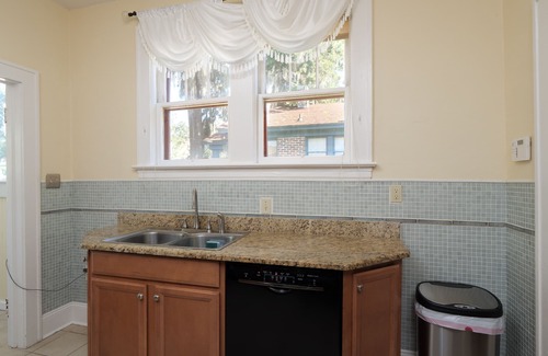 High ceilings, tall baseboards, lots of windows, and gorgeous original hardwood floors are found throughout The Gainesville Cottage. The great room has a gas fireplace. The dining room is large and perfect for entertaining. The kitchen has been fully remodeled with granite countertops, stainless steel appliances, and beautiful wood cabinetry topped with crown molding.