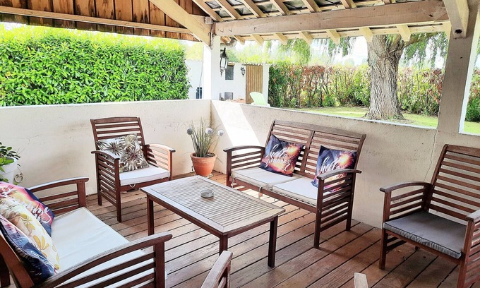 Outside, enjoy an enclosed and shaded garden with dining area, barbecue, deck chairs and a pleasant covered terrace with wooden garden furniture.