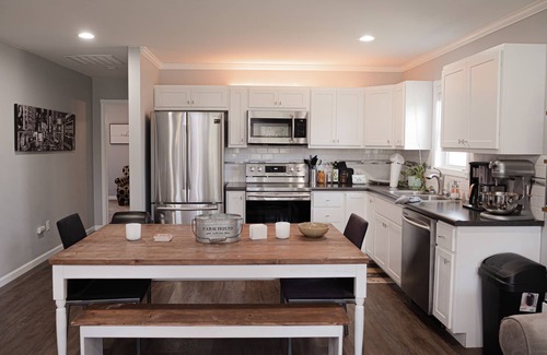 Inside, an updated interior offers plenty of space to unwind with a welcoming living area. The well-equipped kitchen is detailed with stainless steel appliances, providing everything you’ll need for home-cooked meals after a hearty day of hiking.