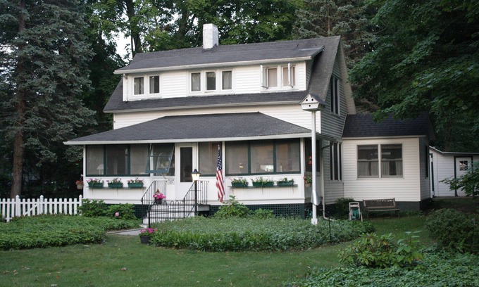 Charming Cottage on Lakeshore Drive with view of Lake Michigan; Amenities include a large screen porch, BBQ deck, fireplace, central air and semi-private beach access; Accommodations for a maximum of 10 people; one queen bed - rest are twin beds; one bedroom has bunk beds, another has a twin with a trundle underneath; linens, dishes, washer/dryer provided; use of bicycles and beach chairs.
