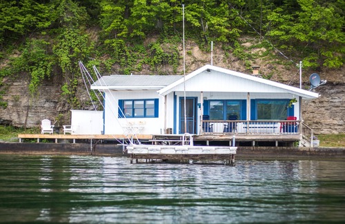 The cottage is bright and sunny, loads of windows to take in the beautiful lakefront setting. And the setting is the main attraction, the beautiful shores of Seneca Lake! From the parking area you descend down to the lakefront cottage (37 steps). The charming covered front porch is built over the water and opens to the yard and the dock. The yard includes a shale beach, gas grill, outdoor dining space, and fire pit. The dock is great for sunning/lounging, swimming (dock ladder), and small craft docking. A paddleboat and kayak are provided for guest use. The cottage itself is fresh and sunny with an open floor plan including large living/dining room. The bedroom is outfitted with a queen size bed, plus there are 2 couch/futons in the open living room, providing total sleeping for 6 guests. Dining table seats 6. The galley style kitchen is bright and sunny and looks out over the water, outfitted with all standard appliances and amenities. The bathroom is a full bath with shower stall. Cottage is decorated in summer red, white, and blue, it feels like vacation from the moment you step inside!