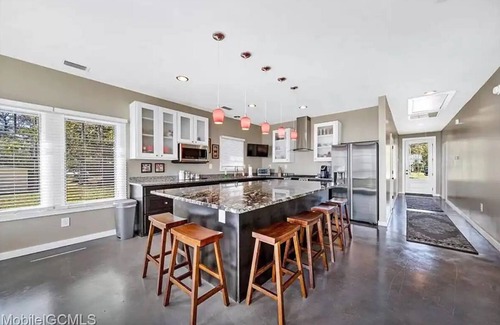 This charming cottage sits directly on the bay on Mon Louis Island and provides breathtaking views from most of the home! You will love the open floor plan and the huge island in the kitchen. Enjoy your morning coffee on the comfortable covered porch watching the sunrise over the bay, an afternoon grilling out, or an evening relaxing by the fire. The beautiful Dauphin Island beaches are just a 10 minute drive away and 30 minutes to historic Downtown Mobile! No ocean access from the property.