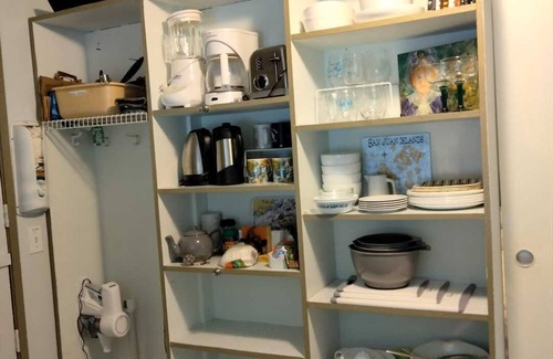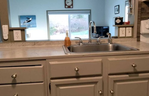 A Food Lovers' Kitchen: The kitchen is fully equipped for gourmet meal preparation. Within arm's reach, you will find all of the kitchen appliances and utensils that you may expect to find in most homes. Fresh whole bean and ground coffee provided. Feel free to help yourself with the pantry items, including specialty coffee, herb tea, and spices. There is a variety of fresh herbs growing in the garden to add to your favorite dish. Take one step down from the kitchen into the living room, where you can enjoy a meal at the quaint dinette set.
