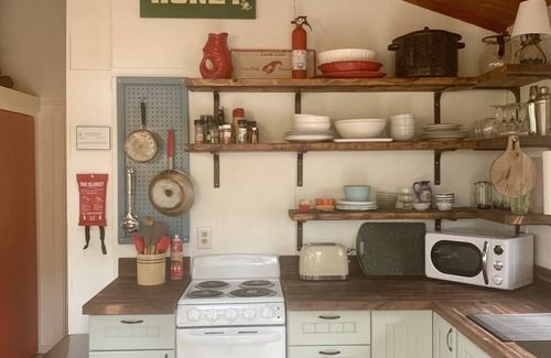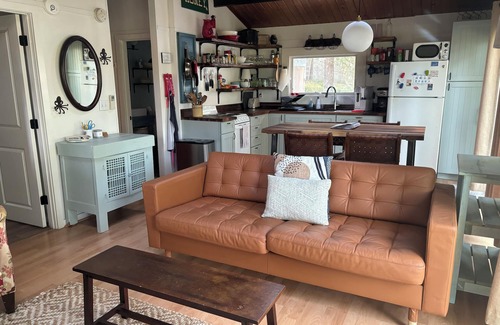 The open-plan living space has two sets of sliding doors that open up onto the deck, providing ample natural light. There is a small but well-equipped kitchen, renovated in winter 2023. Appliances include a full-size refrigerator, electric range, microwave, coffee maker, toaster, blender and food processor. In the kitchen, you'll also find an AquaTru countertop reverse osmosis drinking water system that provides ultra clean water for drinking and cooking. A counter height table with seating for four is between the kitchen and living area. Two additional chairs are in the hallway closet.