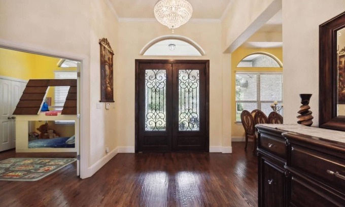 Enjoy a peaceful stay at this 5-bedroom house in Cleburne. The property features 1 king bed, 3 queen beds, and 1 bunk bed, perfect for families or groups. With 5 bathrooms, including a jetted bathtub, guests can relax and unwind. The living room offers 2 futons for additional sleeping space. AC, heating, and other essentials are provided for a lovely stay. We look forward to welcoming you to our place. This also features a guest home on the side with a bedroom and 2 couches that convert into queen beds