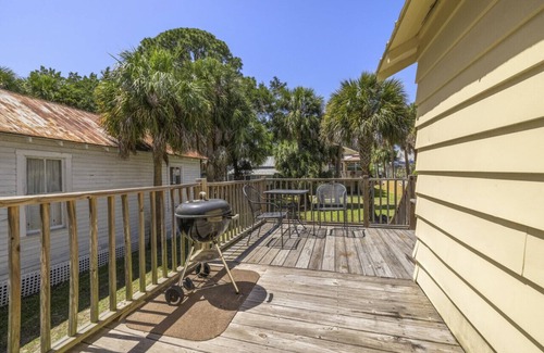 The cottage has two porches, both with comfortable seating. The front porch overlooks First Street and its ancient live oaks, making it the perfect spot to relax and people-watch. The back porch is private and has a charcoal grill, making it perfect for outdoor dining or enjoying a quiet evening.
